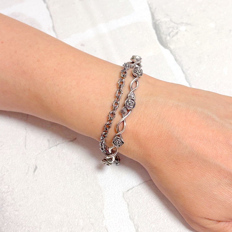 絡み合うツタが特徴的なバングルに、イバラのチェーンを重ねたレイヤードを楽しめる画期的なアイテム。