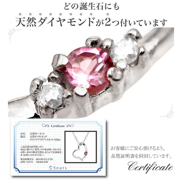 シルバー925の地金が、豪華なハートシェイプ、中石に誕生石を留め両脇に天然ダイヤ2石が大切なバースストーンを守っています。