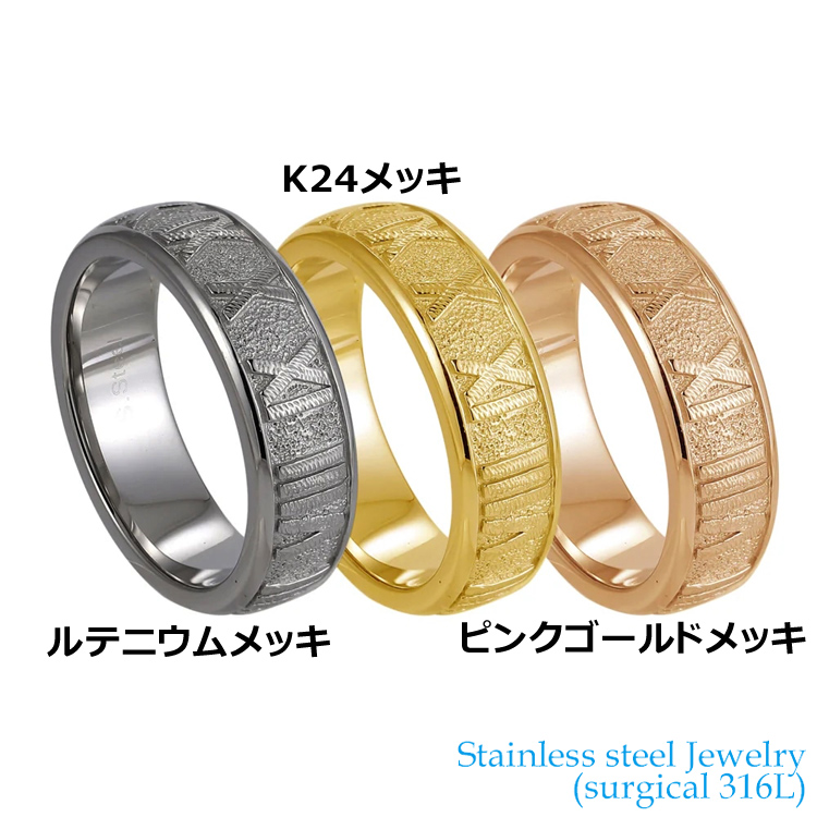 ローマ数字デザインと淵に入ったハワイアン柄がお洒落な男女兼用の幅広リング。